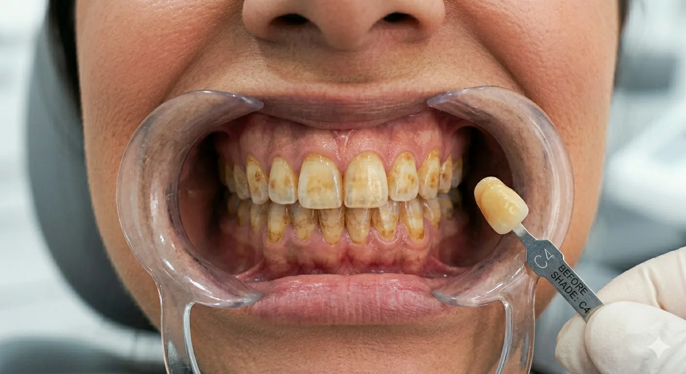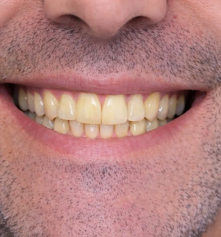 A patient came to the clinic concerned about the color of their teeth, which had a generalized yellowish tint affecting the aesthetics of their smile. After clinical evaluation, a combined teeth whitening treatment was recommended, which allows for more effective and long-lasting results.
