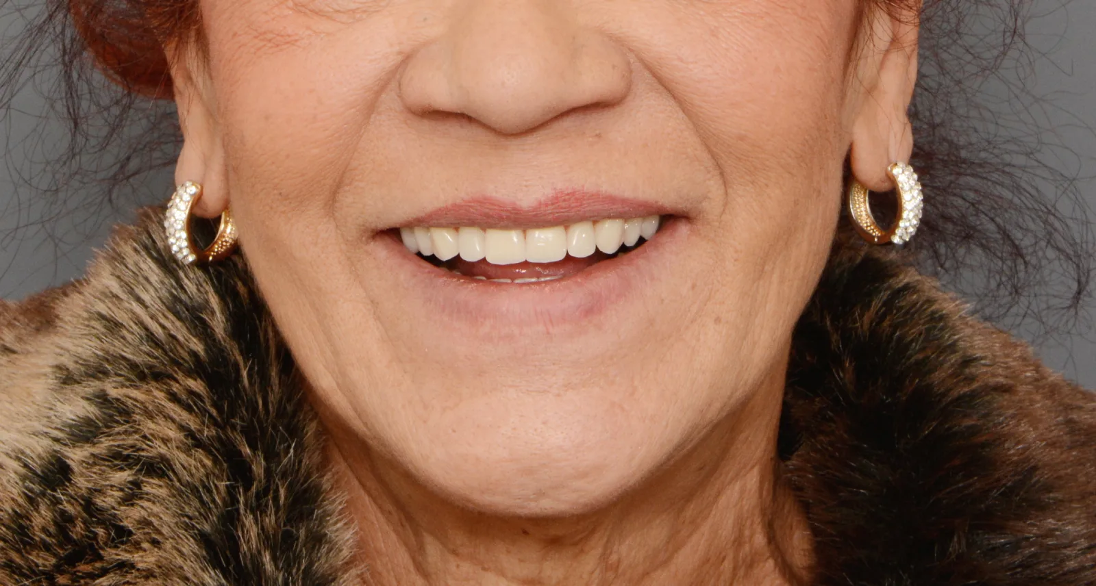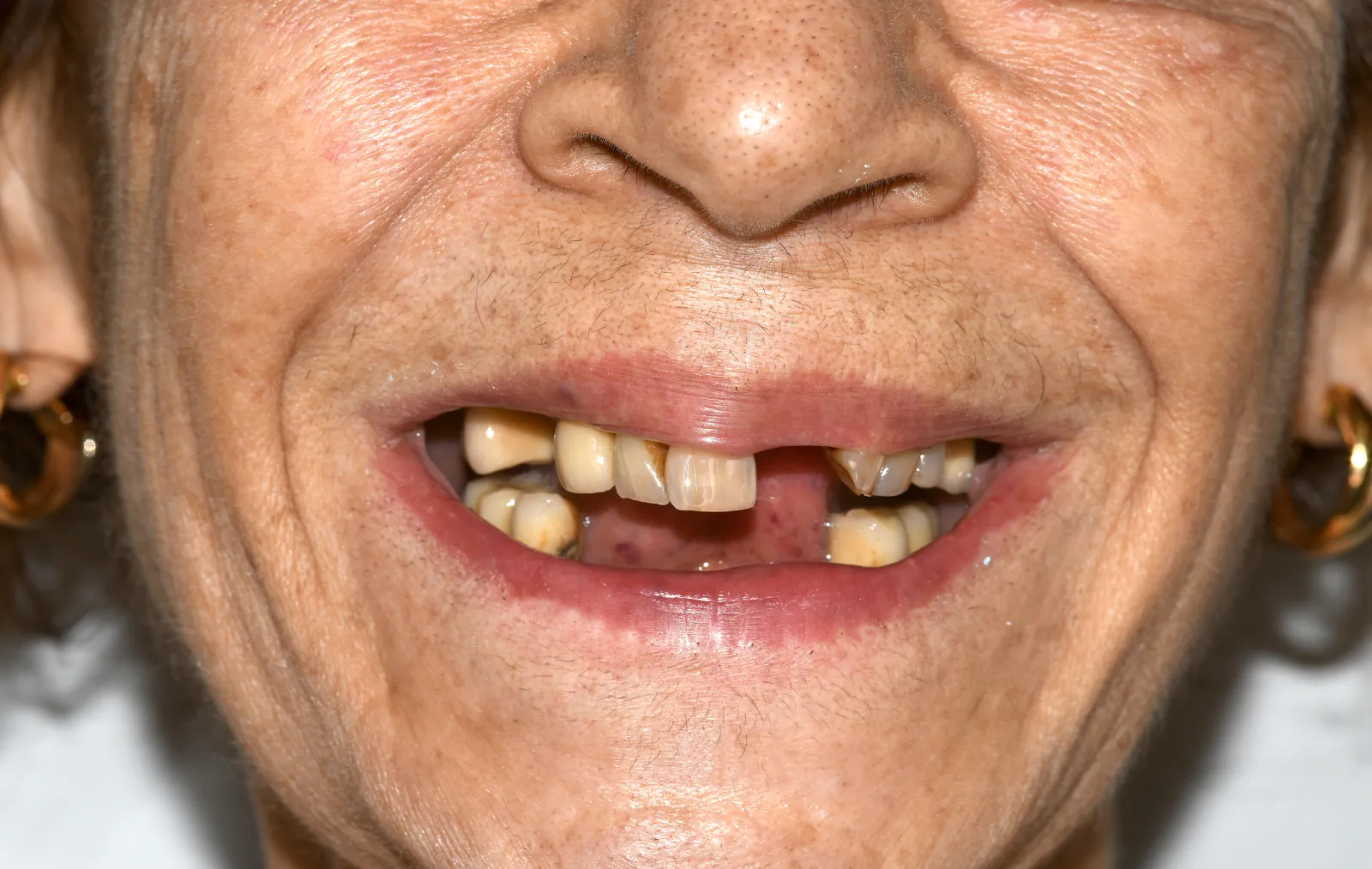 A woman presented to the clinic with advanced deterioration of her oral health as a result of gum disease (periodontitis). The examination revealed bone loss, tooth mobility, gingival recession, an altered smile, and impaired chewing function. The periodontal disease had not only affected her gums… it had changed the way she smiled and how she lived her daily life.