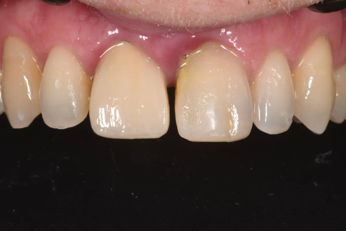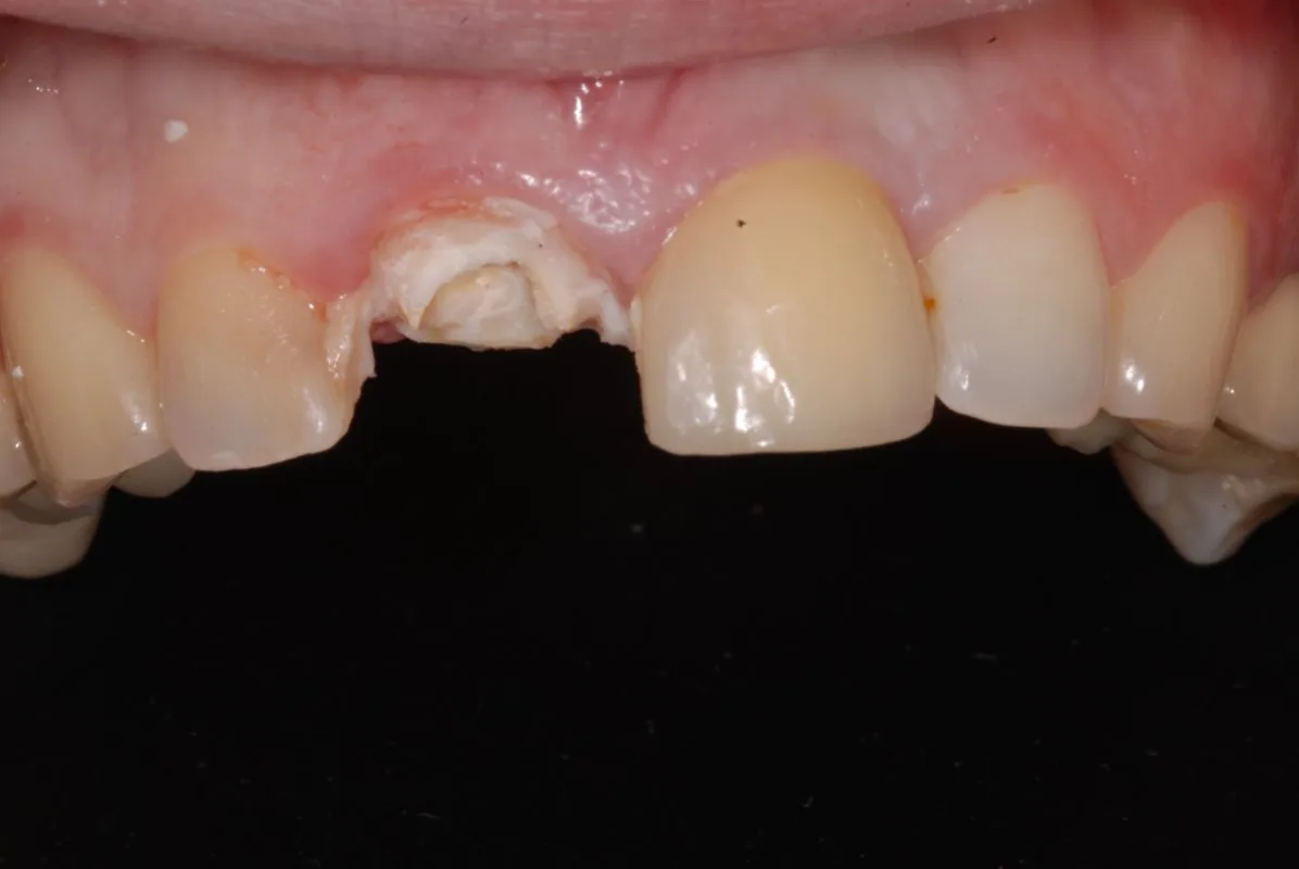 A female patient presents to the clinic following an accident involving a previously treated tooth. Examination reveals a severe fracture of the central incisor, a tooth that has undergone root canal treatment, with irreversible structural damage and significant aesthetic impact (the most visible area of the smile). This is an urgent situation, both functionally and emotionally.